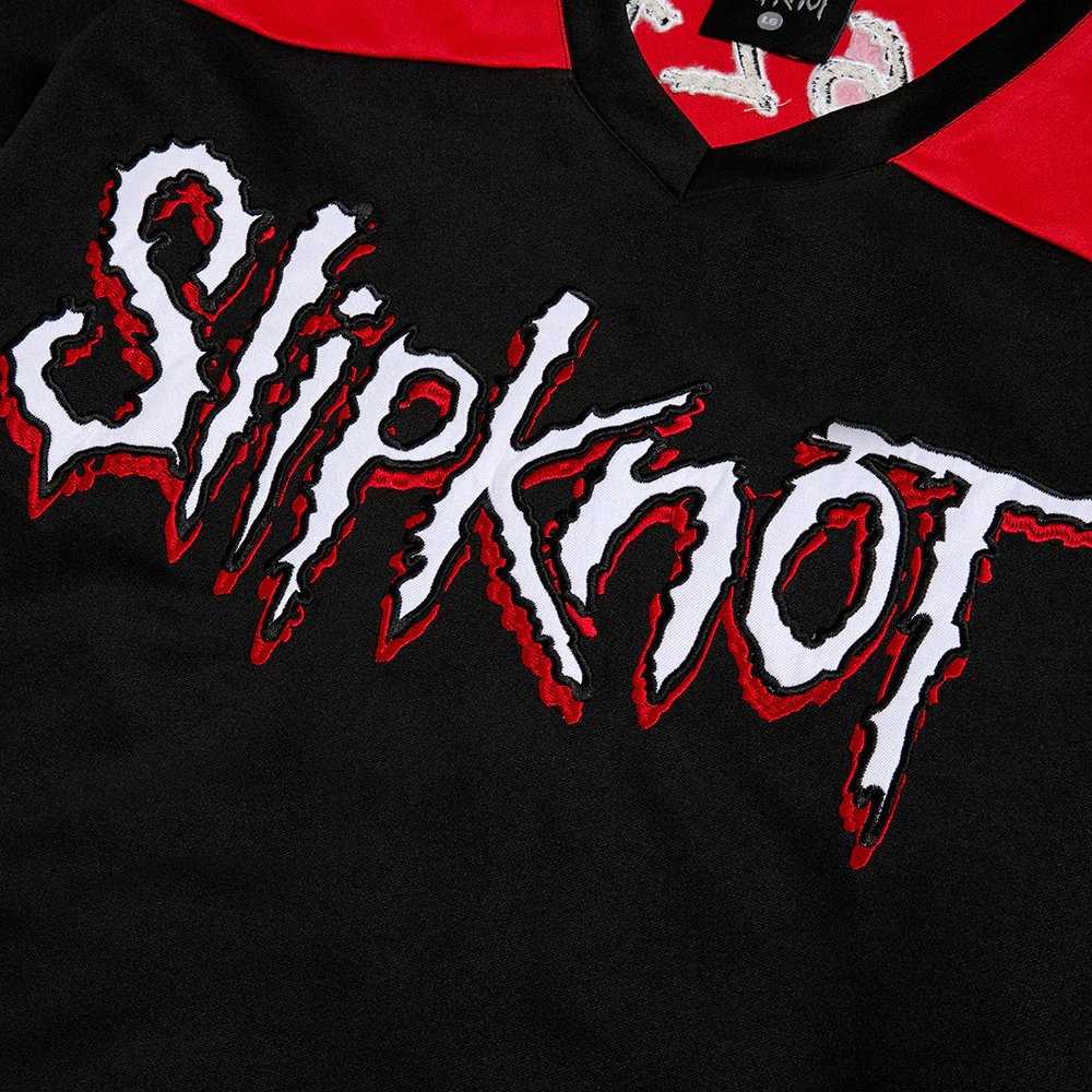 Black white and red hockey jersey featuring embroidered āSlipknotā logo on front, ā9 point starā on sleeves, ānumbersā, āTribal S with 9 point starā logo on back with Slipknot woven tag.