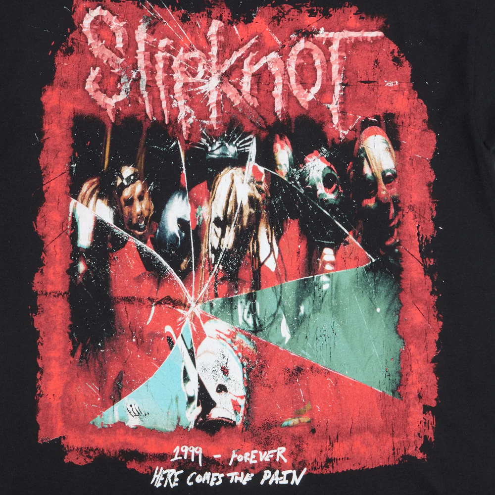 Black t-shirt featuring "Slipknot" album cover front graphics and "Self Titled" tracking list screen printed graphics.